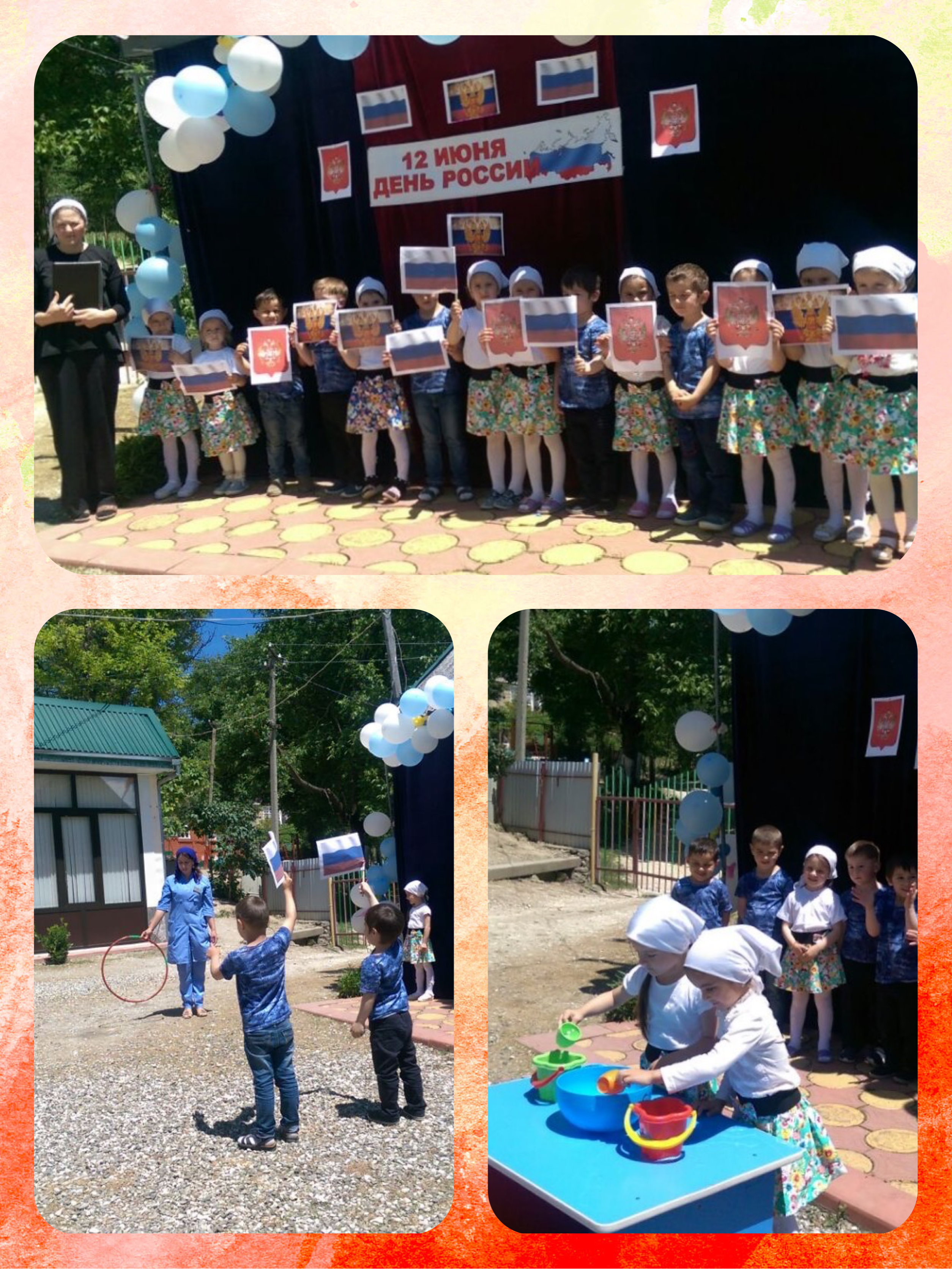 Мероприятие было проведено на летней площадке. Площадка была украшена символикой Р.Ф. Детям было рассказано, что День России – это праздник свободы, мира и добра. Этот праздник символизирует единство всего нашего многонационального народа, напоминает, что все несут ответственность за настоящее и будущее нашей Родины. Дети были ознакомлены с главными символами России – герб, флаг и гимн. Детьми были рассказаны стихи, спеты песни о России, были рассказаны пословицы о Родине.