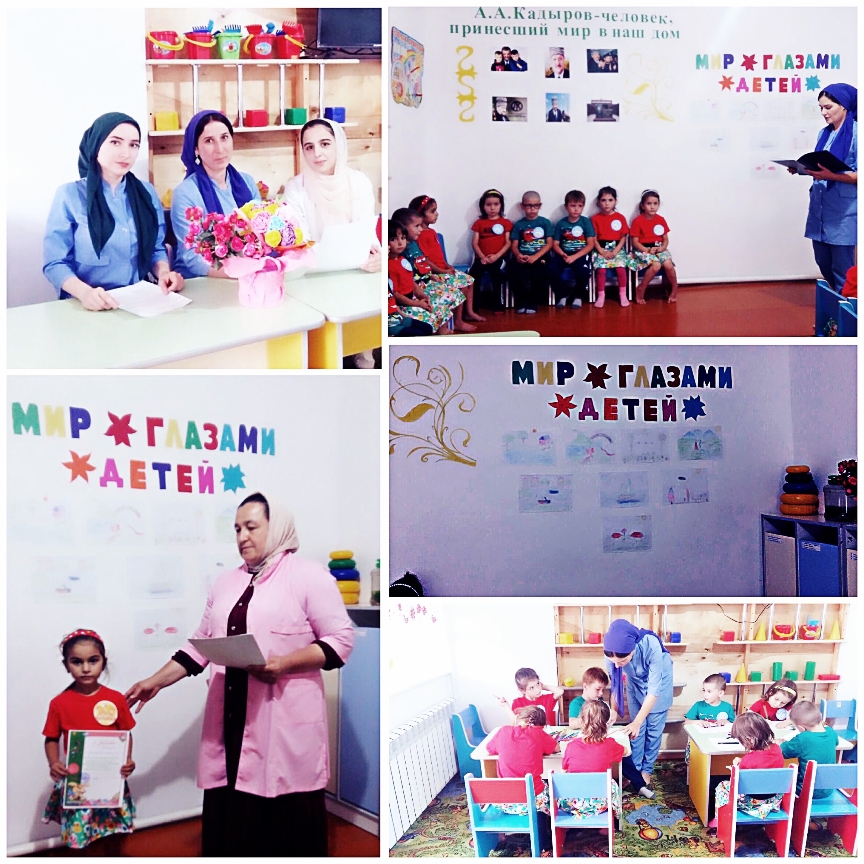 17.08.2017В соответствии с планом мероприятий, приуроченных 66-й годовщине со дня рождения первого Президента Чеченской Республики, Героя России А.А.Кадырова в МБДОУ «Детский сад с.Зандак» среди воспитанников старшей группы «Солнышко» с 15-17 августа 2017 г. состоялся конкурс рисунков на тему «Мир глазами детей». По подведенным итогам конкурсной комиссии призовые места получили : 1-е место – Т.Сумила ; 2-е место – Г.Ирада ; 3-е место – С.Сайфулла.Детей, получивших призовые места заведующая - Айдарсолтанова Л.М. наградила грамотами.