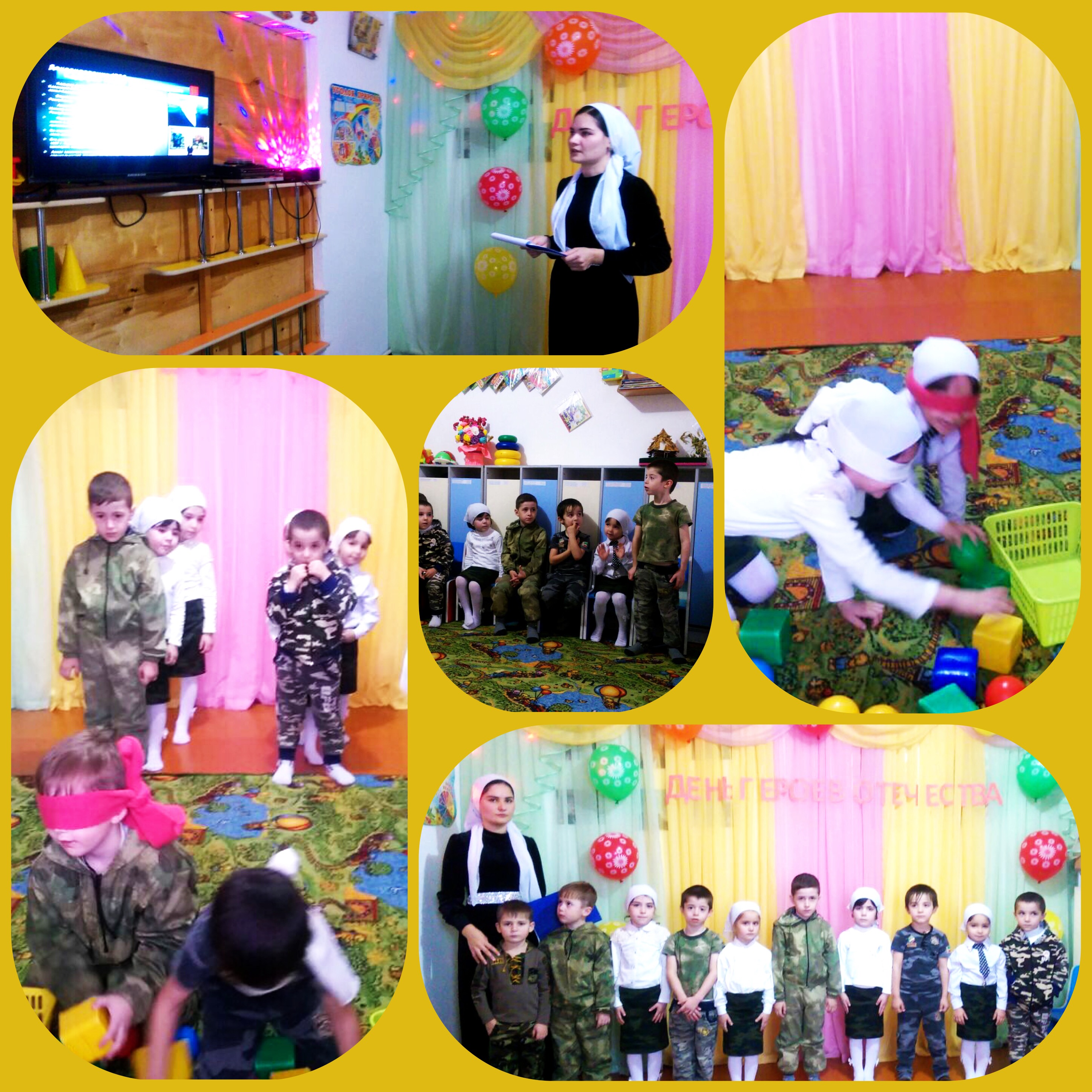 Воспитатель средней группы, Шахтиева М-А., представила мультимедийную презентацию «Герои Отечества» к памяти павших бойцов и ныне живущих Героях Отечества, которая, несомненно, оставила неизгладимый след в детской душе. В средней группе «Солнышко» также был проведен утренник, приуроченный ко Дню Героев Отечества.